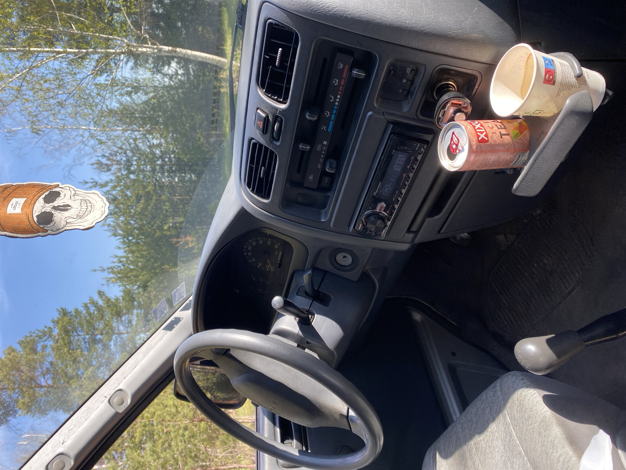 interior of a vehicle, presumably a van, with the dashboard and front seats visible. The dashboard is grey and features air vents, climate control buttons, and a Pioneer car radio. There's a cup holder attached to the dashboard, holding a paper cup filled with liquid and a can of Xixo Ice Tea. The steering wheel is grey and positioned to the left. A gear stick is visible next to the front seat. A skull sticker is affixed to the front windshield. Through the windshield, trees and a blue sky are visible, suggesting an outdoor location. While the precise location in Pancharevo, Bulgaria is not evident from the image, the environmental details suggest a potentially rural or wooded setting. No people are visible in the image.