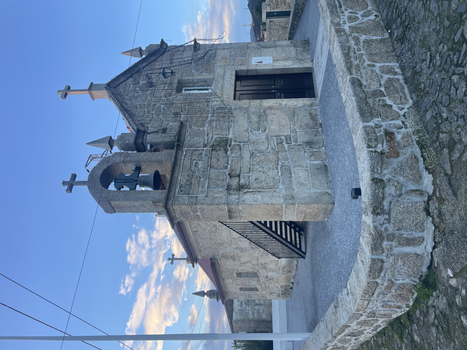 A stone church with a bell tower and cross stands under a blue sky streaked with wispy clouds