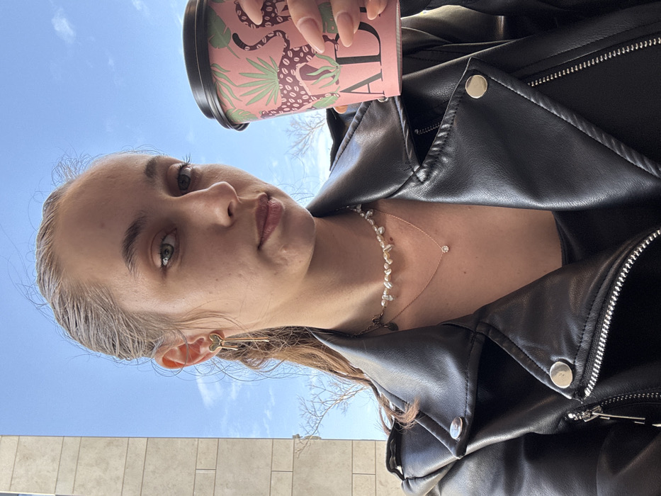 A young female subject is depicted in a close-up, outdoors, within an urban environment in Tel-Aviv, Israel. She has light skin, light brown hair styled slicked back, and is looking directly at the camera with a neutral expression. She wears a black faux leather motorcycle jacket with silver zippers and snaps, over a black top. Jewelry includes a gold-toned heart-shaped earring with dangling elements on her left ear. Around her neck, she wears two necklaces: a choker-style necklace composed of irregular white pearls or beads, and a delicate gold chain with a small, single clear stone pendant. Her right hand, with light-colored fingernails, holds a disposable coffee cup. The coffee cup is pink with a pattern of green tropical leaves and dark spotted feline figures (resembling leopards or jaguars). Partially visible text on the cup includes the letters "AD." The cup has a black plastic lid. The background features a clear blue sky with minimal clouds. To the left, a light-colored building structure, possibly stone or concrete, is visible. Bare tree branches are discernible against the sky in the mid-ground, suggesting a non-leafy season.