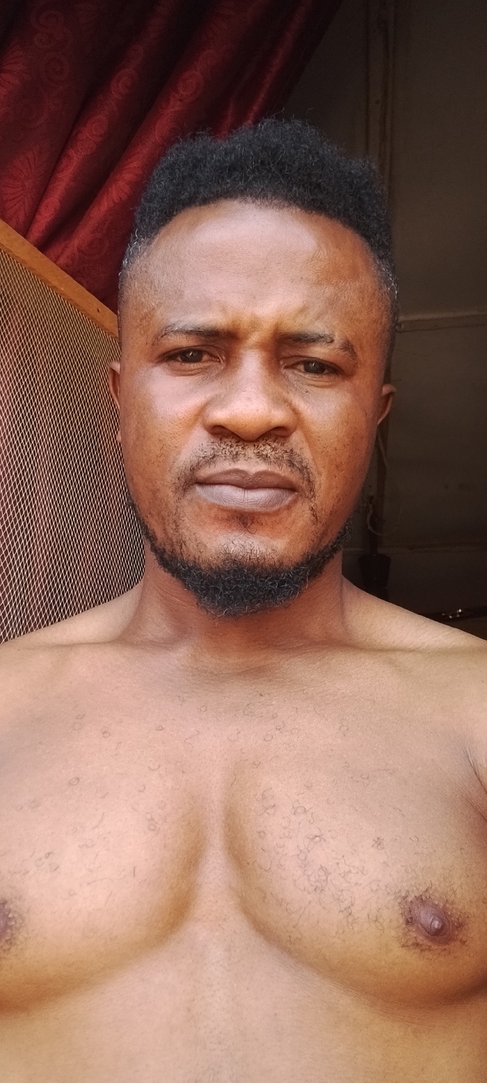 A shirtless man looks directly at the camera. He has short, dark, curly hair and a trimmed beard. Skin is light brown. His chest and shoulders are bare. Behind him, there's a screen and a glimpse of dark red fabric. The background is slightly out of focus.