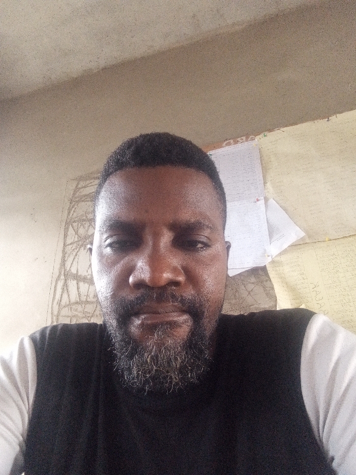 A dark-skinned adult male with a short, dark haircut and a full, dark beard with significant grey/white streaks is depicted in a medium close-up, facing the camera directly