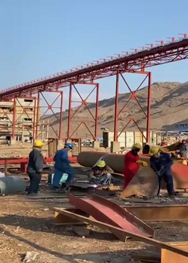 The video captures an outdoor construction site with multiple workers engaged in various tasks. In the foreground, several workers, clad in protective gear including hard hats and work uniforms of various colors, are gathered around a metal surface. One worker is actively welding, with bright sparks emanating from the welding point. Other workers seem to be observing or preparing the materials. Behind them is a substantial red steel structure, possibly a conveyor belt system, supported by tall metal beams. In the background, there's a building under construction and a mountainous landscape under a clear blue sky. The ground is uneven and littered with construction debris, including scrap metal and other materials. The scene depicts an industrial environment with ongoing construction and metalworking activities.