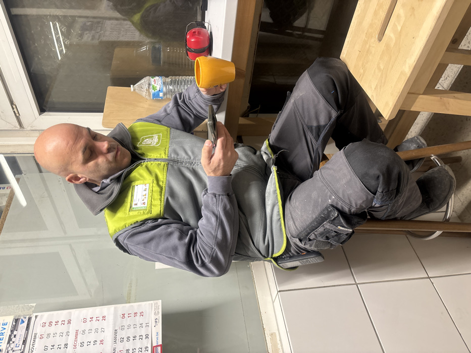 A bald man in a gray and lime green work vest and gray pants is seated, looking at his phone while holding a yellow mug. A water bottle and red earmuffs rest on a nearby surface. The man is sitting with his legs elevated on what appears to be a chair. A calendar is visible on the wall behind him, displaying parts of November, December, and January. The scene seems to be indoors.