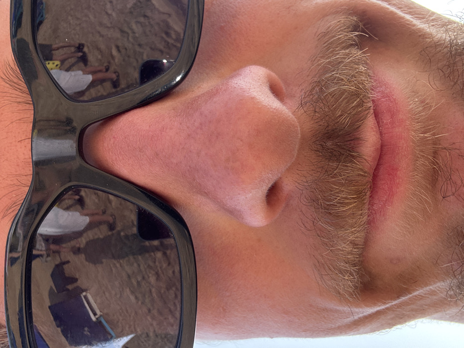- "The image displays a close-up, upward-angled view of an adult male's face, encompassing his forehead, dark-framed sunglasses, nose, and mouth area with a light-colored mustache and stubble" by FM-reQ1G2, licensed under CC BY 4.0