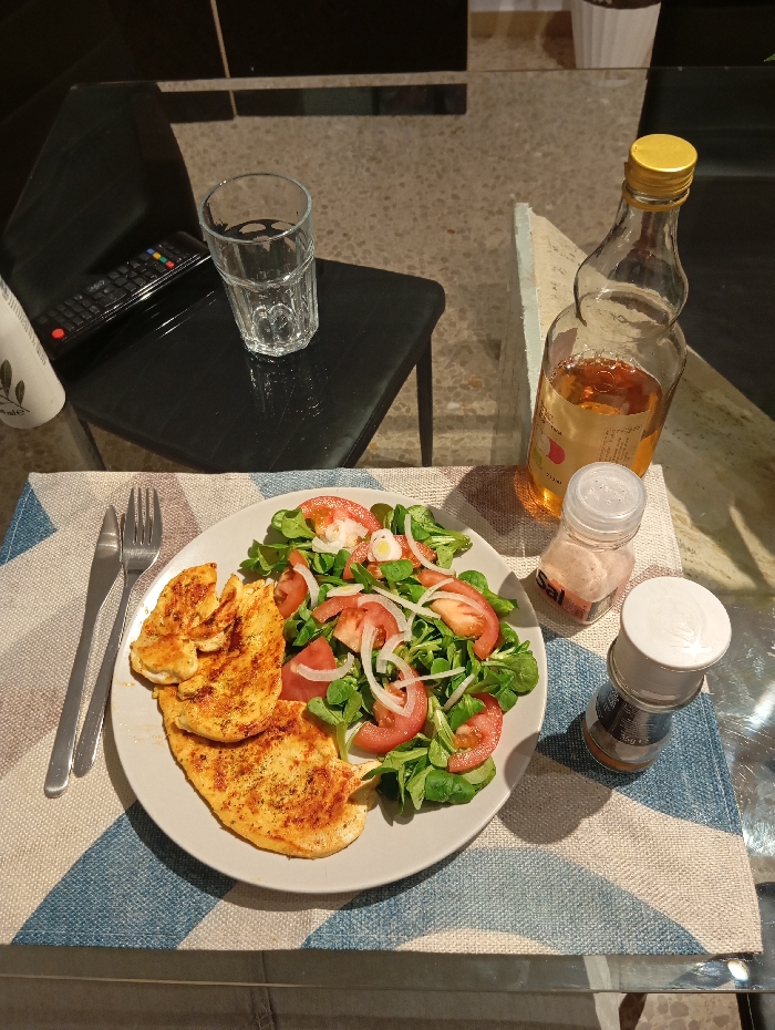 The scene depicts a prepared meal set on a glass table within a residential interior in the city of Ripollet, Spain. In the foreground, a placemat featuring a blue and off-white geometric pattern supports a white plate. The plate contains two seasoned, cooked chicken breast fillets alongside a salad composed of lamb's lettuce, sliced red tomatoes, and white onion rings. A silver fork and knife are placed to the left of the plate. To its right are two seasoning dispensers: a clear plastic shaker containing pink salt (marked "Sal") and a taller, dark-bottomed grinder with a white top. Adjacent, a clear glass bottle with a yellow cap holds an amber liquid. A black chair, partially visible in the mid-ground, supports an empty clear glass tumbler and a black television remote control. The background includes reflections on the glass table, dark furniture, light-colored terrazzo-style flooring, and a fragment of a white potted plant. No individuals are present.