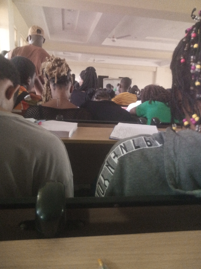 The scene depicts the interior of a large lecture hall or classroom, situated in Awka, Nigeria