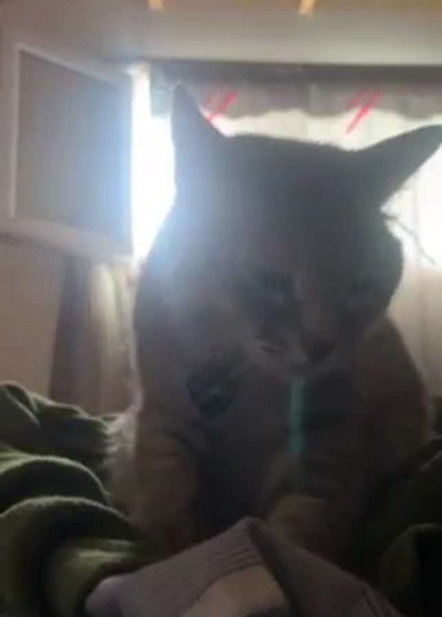 A close-up shot depicts a tabby cat sitting on a green blanket with white and purple stripes, in what appears to be a bedroom