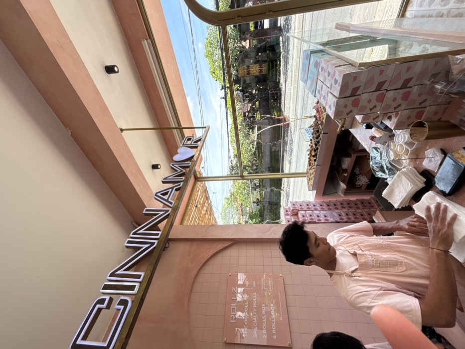 Inside a bakery, a worker in a pink shirt prepares pastries on a counter. Boxes of treats with heart decorations are stacked nearby. Outside, a window shows a street with lush greenery. The bakery's sign, "CINNAMOR," is prominently displayed. A menu board lists the offerings as "Rollz," with options for individual and boxed selections.