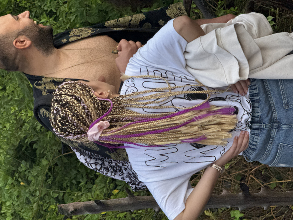 A woman with blonde braids intertwined with purple strands rests against a man with a bare chest and beard. He wears a dark, patterned kimono-style garment. The woman is in a white graphic tee, light-wash denim, and a cream-colored sweater. A pink scrunchie ties back some of her braids. The background is blurry foliage.