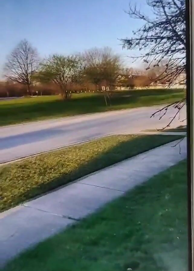 street scene with a sidewalk and grassy areas on either side. A silver SUV drives along the street. There are trees lining the grassy area, and the sky is clear and blue.