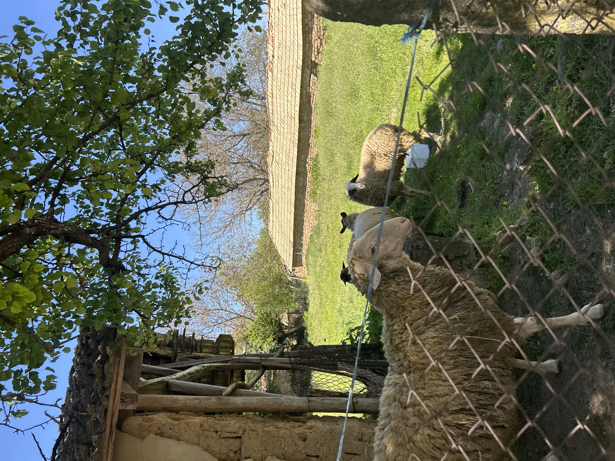 The scene appears to be taken at ground level, possibly through a chain-link fence. There are three sheep of varying sizes in the right foreground. They stand on grassy ground dotted with small yellow flowers. Behind the sheep, a long, narrow brick building sits on a higher level of the grassy terrain. Beyond the building, trees extend toward the skyline. A tree with green leaves dominates the left foreground, partially obscuring the blue sky. At the bottom left, an earthen structure with a decaying wooden roof is visible. The location is likely Gorsko Ablanovo, Bulgaria, as specified.