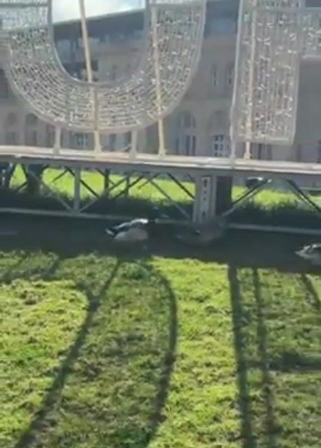 large, illuminated sign that says “DORM” on a green lawn in front of a large building. Two ducks are lying on the grass underneath the sign. The sun is shining brightly, and there are some clouds in the sky. The video is taken from a low angle and pans slowly from left to right.