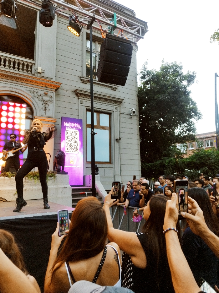 The image depicts an outdoor musical performance taking place in Providencia, Chile. A female performer with light-colored hair, dressed in a black top with voluminous sleeves, black pants, and dark boots, stands center-stage, holding a microphone to her mouth, actively singing. Behind her to the left, a male musician in dark attire and sunglasses plays a light-colored electric guitar. The stage is an elevated platform featuring a large vertical LED screen displaying multi-colored square patterns on the left and a tall purple banner on the right advertising "MADONNA TRIBUTO" with a QR code and Instagram handle. A dark statue, resembling a lion or bear, rests on a stone pedestal behind the banner. Above the stage, a metal truss structure supports several stage lights, including a black moving head light and a round, yellowish LED par light. A black pole extends from the stage level to the truss, mounting a vertical array of four black line array speakers to the right of the stage. The background features a multi-story building with a light-colored, ornate facade, characterized by architectural details such as cornices and window moldings. Several windows are visible, including one prominent window to the right of the stage with a light blue tint. A small white security camera is mounted on the building's facade to the right of this window. Beyond the building and speaker system, a large, dense green tree is visible. The sky is bright and overcast. A dense crowd of people, primarily adults, gathers in front of the stage, separated by a metal barrier. Numerous audience members, particularly in the foreground and mid-ground, are holding up smartphones to record or photograph the performance. One woman in the immediate foreground, with long brown hair and a white top, holds a black smartphone with a purple case displaying app icons. To her right, another woman holds up a black smartphone horizontally. An arm on the far right holds a smartphone vertically. The crowd faces the stage, observing the performance.
