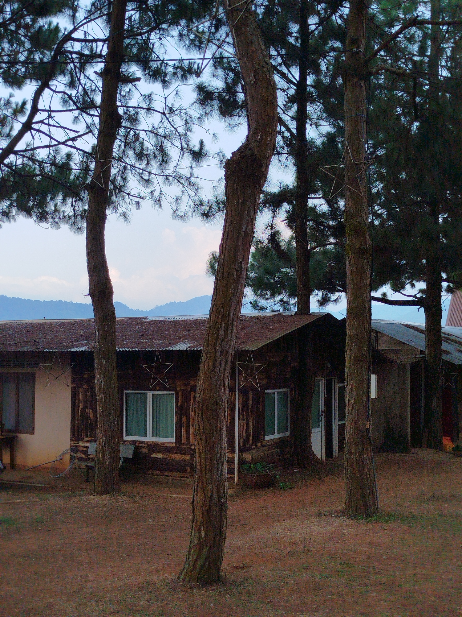 The image depicts a one-story building, possibly a cabin or lodge, situated in what appears to be a wooded area near Krăng Chớ, Vietnam. The building has a dark, possibly corrugated metal roof and walls constructed of dark wood and concrete. Several trees, possibly pine trees, stand in the foreground, partially obscuring the view of the building. These trees are decorated with star-shaped decorations. The ground is covered with brown foliage, likely fallen pine needles. The sky is overcast and pale. The presence of the stars decorating the trees suggests a festive or celebratory event. There is no visible activity or people.