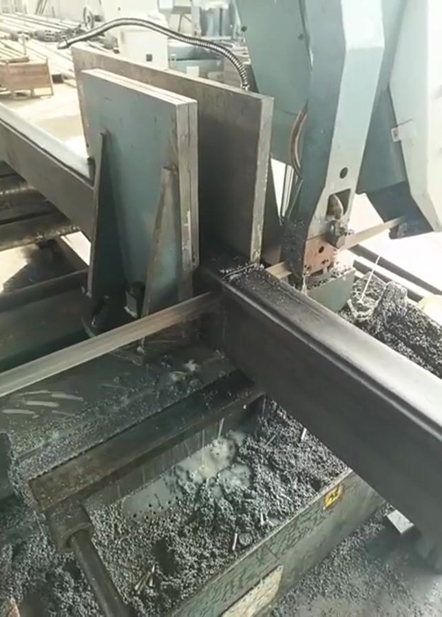 metal band saw cutting through a long, dark gray metal rectangular tube