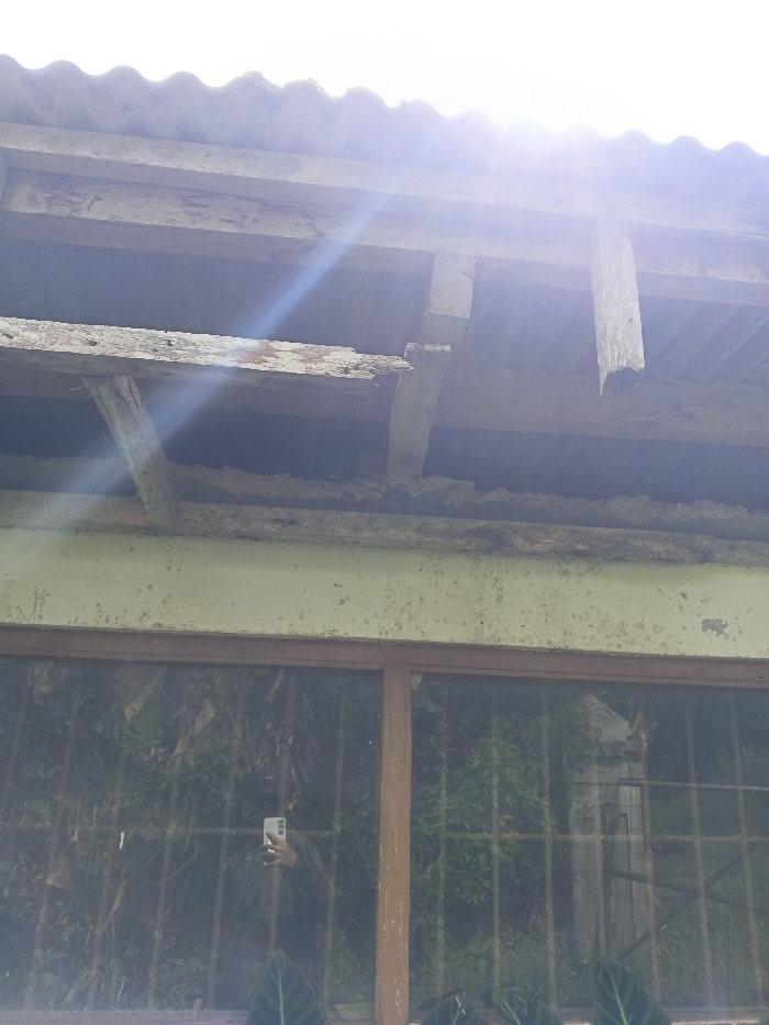 n exterior building featuring a weathered roof with exposed wooden beams and corrugated metal sheeting. The structure exhibits signs of age and deterioration. Below the roofline, there is a section of exterior wall with a window. The window is dark and reflects the photographer holding a smartphone, capturing the scene. Behind the glass, vegetation is visible, adding to the natural setting.