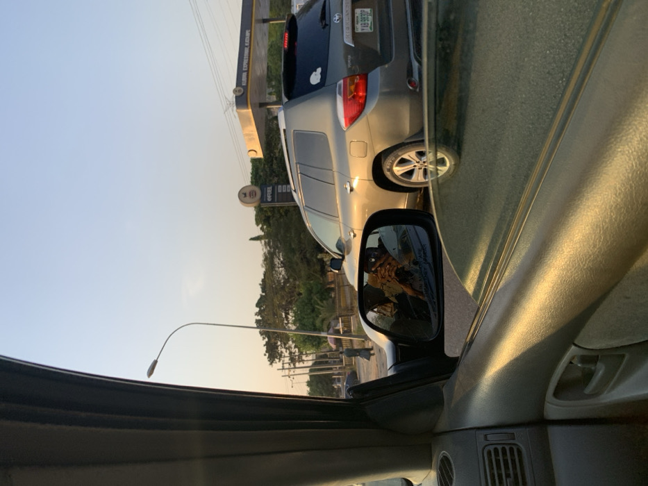 The image captures a roadside scene in Gwarinpa, Nigeria, from the interior of a stationary or slow-moving vehicle, facing forward and slightly to the right. The foreground reveals the beige door panel of the observer's vehicle, including an air vent and door handle. A side mirror, displaying prominent cracks, reflects a blurred image of the vehicle's interior and a person holding what appears to be a phone or camera. Outside the observer's vehicle, a grey Toyota Highlander SUV is positioned to the right, illuminated by strong, warm sunlight on its metallic surface. Its rear is visible, including the tail lights and a license plate reading "YAB 983 DP." A small white decal is affixed to the rear window. In the midground, beyond the Highlander, an Oando fuel station is visible. Its distinctive yellow-and-black signage, featuring the Oando logo and "OFUEL" text, is present on a pole. A pump canopy structure, partially inscribed with "OANDO EXPRESSWAY GARAGE," extends over the fuel dispensers. The road surface appears light-colored, possibly asphalt, with a dirt or undeveloped shoulder to the left. A tall, curved street lamp stands to the left of the scene. Further in the background, utility poles with power lines are visible against a clear, hazy sky, characteristic of golden hour lighting. Green trees and foliage line the roadside, and a solitary individual carrying a bag is seen walking on the far side of the road, partially obscured by a utility pole near the fuel station entrance. The overall environment suggests an urban or suburban setting with active traffic infrastructure.