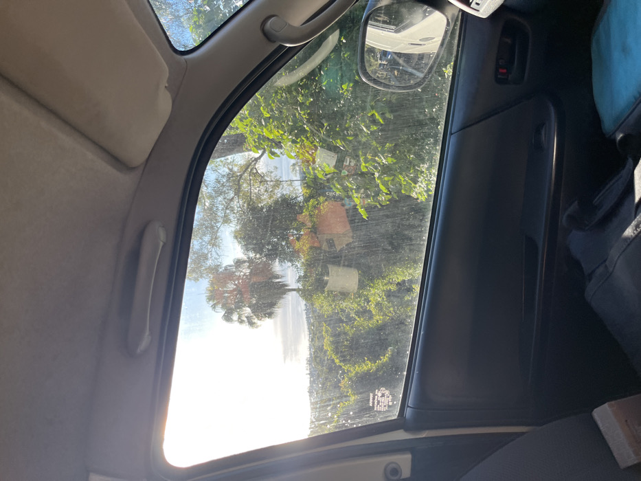 The image depicts a view from the interior of a vehicle, looking out through the front passenger window
