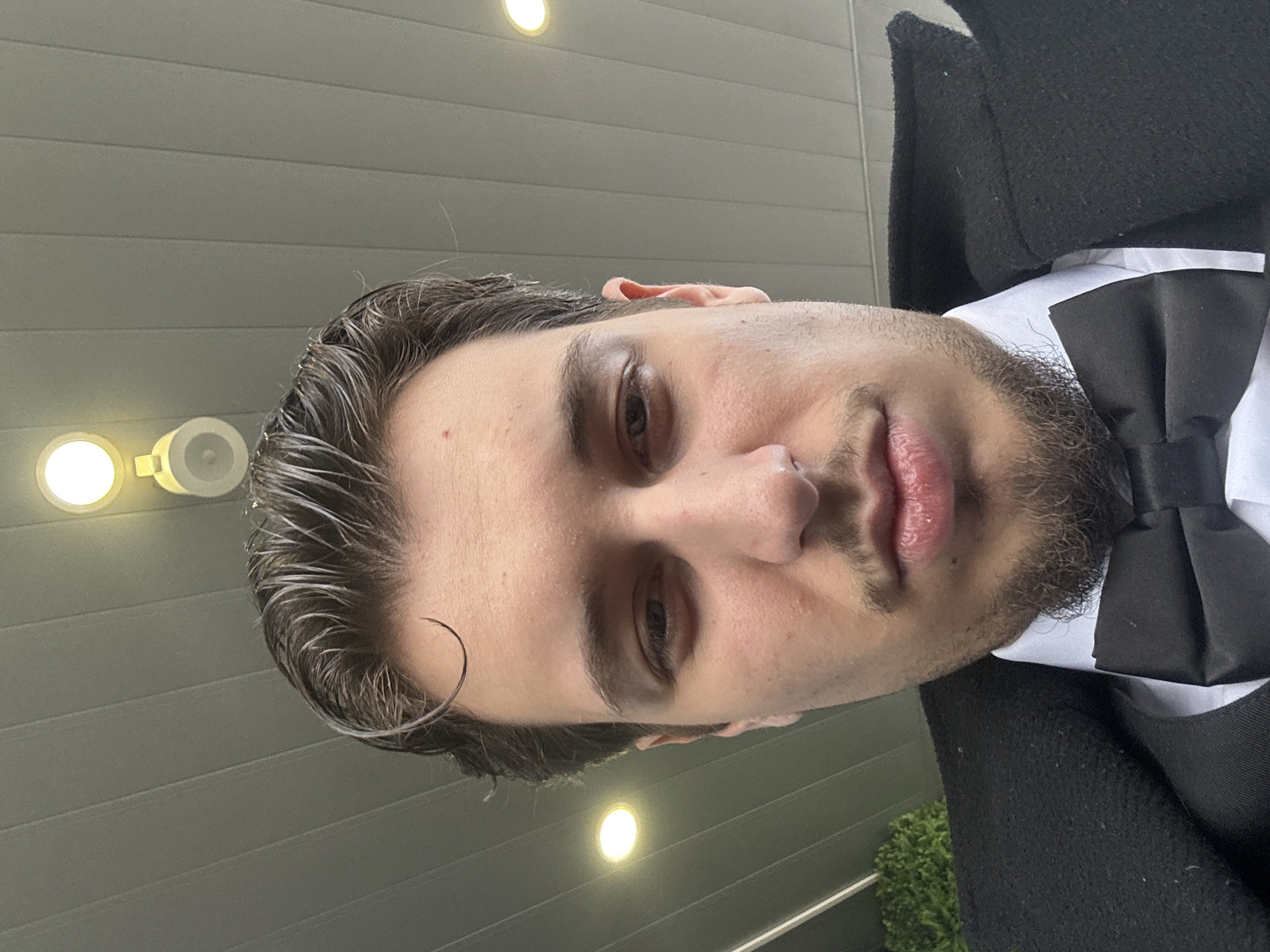 A close-up, slightly angled selfie of a person with light skin, dark hair, and a short beard. The person is wearing a black bow tie, a white shirt, and a black jacket or coat. The hair appears to be styled with product, giving it a wet look, and a single strand curls down on the forehead. The background consists of horizontal grey panels, and two circular light fixtures are visible in the upper left corner. Based on the architectural style, use of materials, and potential vegetation visible on the bottom right, this scene COULD be located in Sofia, Bulgaria, though this cannot be confirmed with certainty from the image alone.