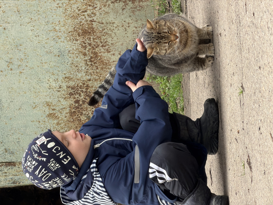 - "In Beryozovy, Russia, a young male individual is depicted squatting on a concrete surface, interacting with a domestic tabby cat" by FM-t12ef2, licensed under CC BY 4.0