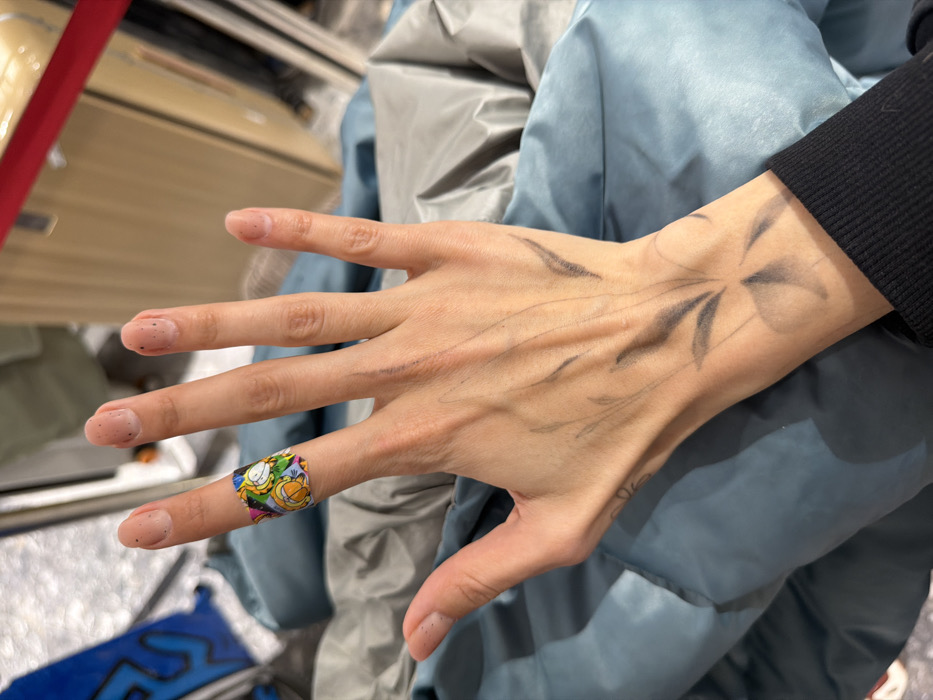 A close-up, dorsal view of a human left hand occupies the central foreground. The hand exhibits light-toned skin, with short, natural fingernails displaying minor dark particulate matter. A colorful, patterned band, featuring multiple cartoon illustrations of Garfield the cat, is applied to the proximal phalanx of the index finger. The dorsal surface of the hand and wrist is marked with dark, stylized linear and teardrop-shaped patterns, consistent with a temporary drawing or tattoo depicting botanical elements. A black fabric cuff covers the wrist. The background is out of focus, revealing crumpled material in shades of blue-gray and dark gray occupying the lower and right portions of the frame. A blurred blue object with a partial "R" graphic is visible in the upper left background, while a light brown vertical surface and a thin red horizontal line are discernible in the upper right. The specific location in Chitose, Japan, cannot be determined from the visual information present in the image.