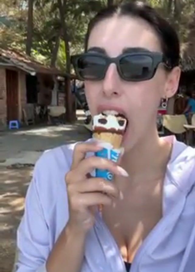 A woman in sunglasses and a purple jacket is eating an ice cream cone. She is standing outside on a sunny day. Behind her are trees, beach houses, and some tables and chairs. She takes a bite of the ice cream cone, chews, and looks at the camera.