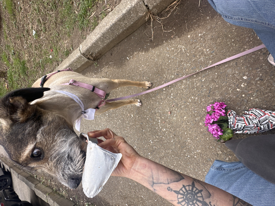 The image displays an outdoor scene in Batumi, Georgia, captured from a low, first-person perspective looking downward. A medium-sized dog, with a mix of brown and grey shaggy fur, is positioned centrally, actively consuming contents from a small, opened, foil-covered container held by a human hand on the right. The dog wears a light pink harness and a white bow-tie accessory around its neck, with a pink leash extending from the harness to the ground. The human subject's visible elements include a left forearm with a prominent compass rose tattoo, a right leg clad in blue denim jeans, and a left leg in dark grey pants, terminating in a patterned shoe. A small pot containing vibrant pink-purple flowers rests on the left shoe. The ground consists of a grey, textured paved surface. To the right, a concrete curb separates the path from a sparse, dry grassy area with exposed soil and weeds. Partially visible parked vehicles are discernible in the background to the far left.