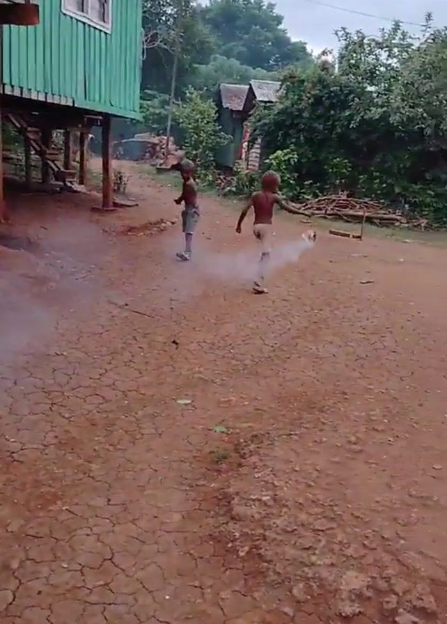 Two shirtless boys run across cracked, reddish-brown dirt in front of a green, stilted house. One boy wears light-colored shorts and the other wears dark-colored shorts. Smoke rises from the ground as they run away from the camera. The camera then pans down to show the cracked dirt ground and briefly shows a boy sitting on the stairs of a house. The video ends with a close-up of the cracked dirt ground with a white ball at the bottom of the frame.