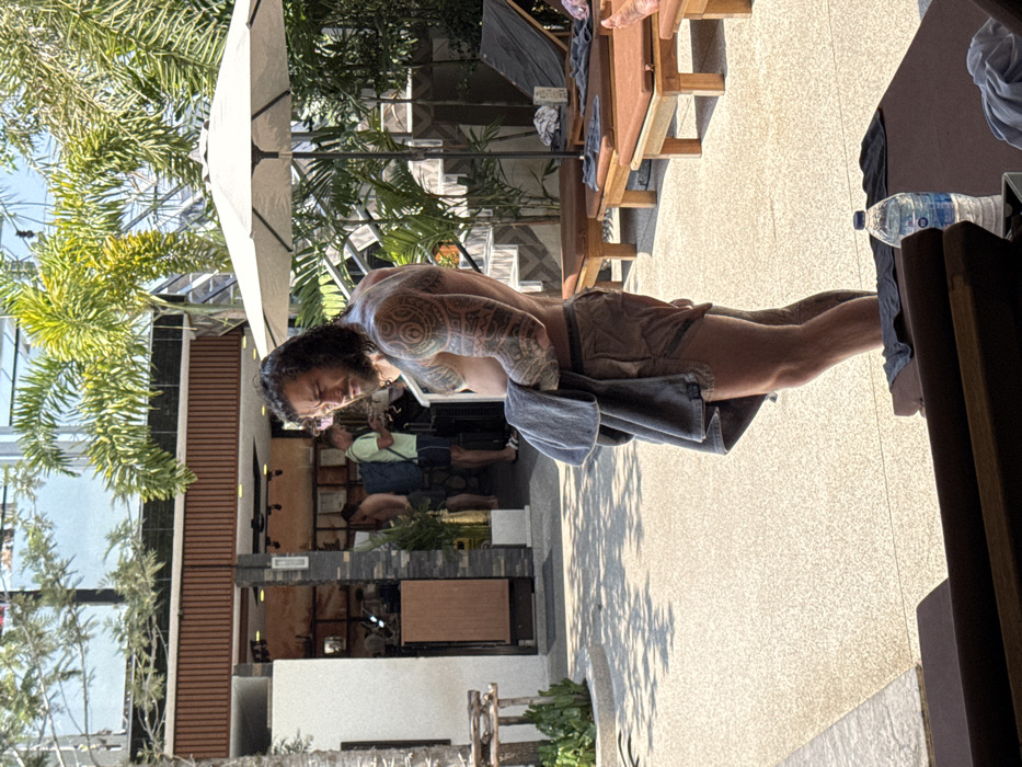 The image captures an outdoor scene in Rawai, Thailand, under bright daylight conditions. The primary subject is a male with long, dark, wavy hair and a beard, shirtless, and wearing light brown shorts. He has extensive tattoos covering both arms and shoulders, featuring tribal or geometric patterns. He holds a grey towel draped over his left arm and stands on a light-colored, textured paved surface, looking towards his left. His skin appears wet or glistening. In the mid-ground, a modern building with a brown wooden facade, large glass windows, and stone-clad pillars is visible. The interior, illuminated by artificial light, reveals what appears to be a reception or lounge area. Two other males are present inside the building: one shirtless with his back partially visible, and another wearing a light green t-shirt and dark shorts, carrying a light blue backpack. To the right of the central figure, a large, light-colored patio umbrella provides shade over a relaxation area. Multiple wooden lounge chairs with dark cushions are arranged on the paved surface. A plastic water bottle with a blue label and a dark cloth are visible on a lounge chair in the immediate foreground. The feet of another individual are visible resting on a more distant lounge chair. A set of light-colored stairs is present between the building and the lounge area. The background features numerous green palm trees against a clear blue sky, indicating a tropical environment.