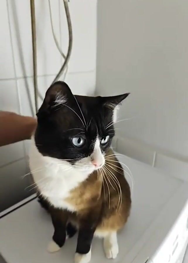 person petting a cat that is sitting on top of a white washing machine. The cat is mostly black and white with some brown coloring. The person is petting the cat with their right hand. The cat seems to be enjoying the petting, as it is purring and looks relaxed. The background is a white tiled wall and some pipes.