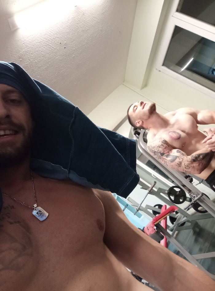 Two shirtless men are pictured in a gym. One man is close to the camera, wearing a dark blue fabric as a head covering and a dog tag necklace. His chest is visible, revealing a tattoo. The other man is further away, lying on a weight bench with his face turned upward and tattoos on his arm and chest. Weights and gym equipment are visible in the background. There is a window in the upper right corner.