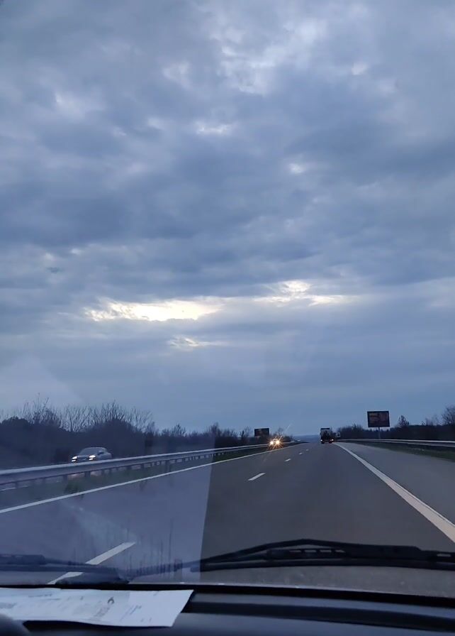 A driver is operating a vehicle on a highway. The weather is cloudy and overcast. Other vehicles are visible in the distance. The camera angle alternates between a view through the windshield and the driver's side window. The landscape includes trees and distant hills.