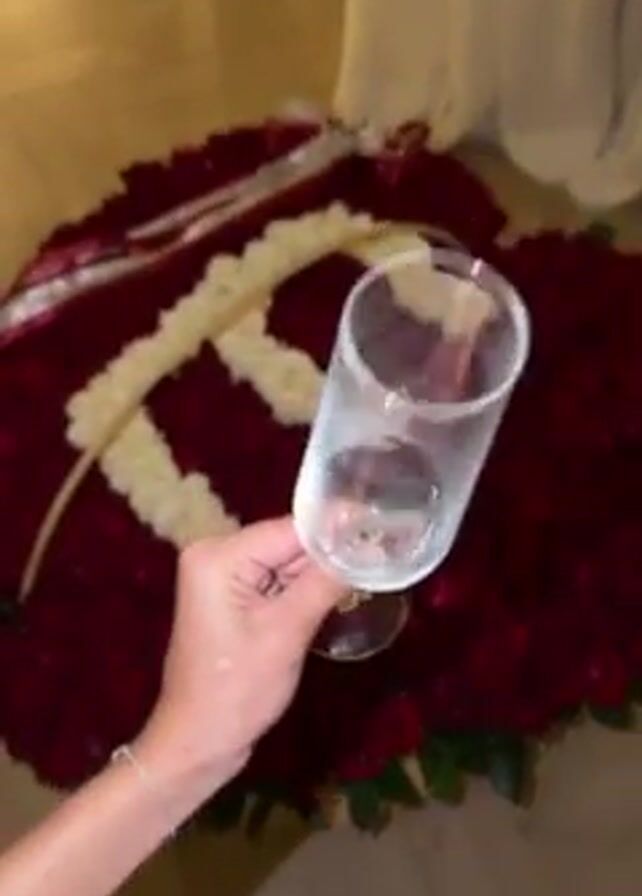 A person holds an empty champagne flute in front of a large bouquet of red roses. A white floral "M" appears on the flowers. The camera focuses on a ring sitting at the bottom of the flute. The person is standing indoors in a room with a wooden floor. A white curtain hangs in the background.
