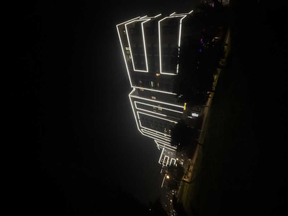The image displays a modern, multi-story building illuminated at night in Plovdiv, Bulgaria. The building's facade is accented with bright white LED strip lighting, tracing prominent horizontal lines along its perimeter and balconies, as well as vertical lines on its main sections. A ground-floor commercial establishment on the building's left side features an illuminated sign displaying the text "LUXTHAM". The foreground consists of a dark green space, likely a park or lawn, with the silhouettes of numerous trees and shrubs obscuring parts of the building's lower levels. Faint streetlights or distant building lights are visible further down to the left. The sky is uniformly dark, indicating a nighttime setting. No individuals or active subjects are visible within the frame.