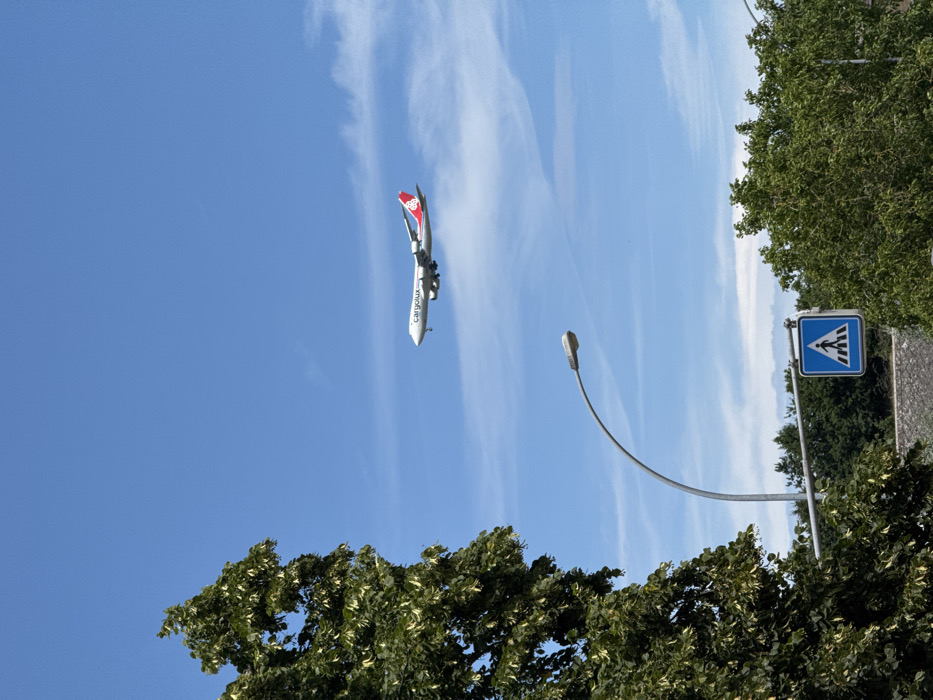 An airplane, labeled "cargolux" in white, soars through a partly cloudy sky. Its tail is red with intricate white markings. The scene is captured from a ground-level perspective, where lush green treetops frame the lower portion. A curved street lamp extends upward toward the aircraft, positioned to the right. Next to the trees, a blue and white crosswalk sign stands out against the greenery.