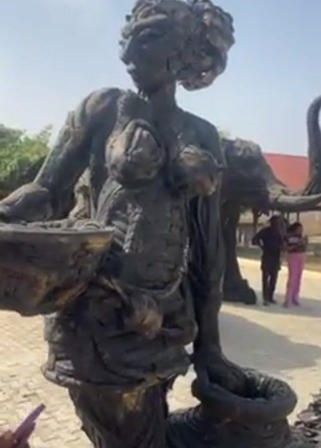 several outdoor metal sculptures, including a large female figure in the foreground. This statue appears to be holding something in its left hand and has one foot resting on a pot. Its head has a textured, almost Afro-like hairstyle. Further back, there's a metal sculpture of an elephant with raised trunk. Two people are standing in the background near the elephant statue; one is wearing a pink jacket. The sculptures are on a paved surface. Another partial statue is also visible in the right foreground.