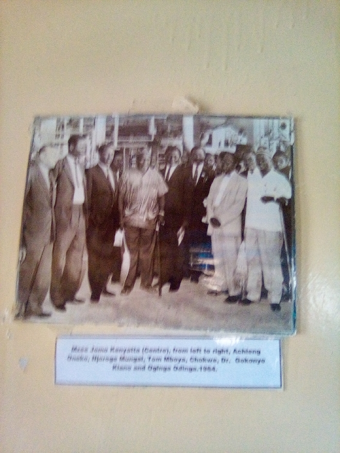 This image depicts a faded, slightly discolored black and white photograph mounted on a light beige wall. The photograph is enclosed in a clear protective sheet, adhered to the wall with a small piece of white tape visible above its center. The physical photograph is located in the city of South Sakwa ward, Kenya. The photograph itself shows a group of approximately eight to nine men standing together outdoors in what appears to be an urban setting, with indistinct architectural structures in the background. The men are arranged in a horizontal line, facing generally towards the viewer. Most of the men are wearing suits, jackets, and trousers. In the center, Mzee Jomo Kenyatta is identifiable, wearing a lighter, patterned short-sleeved shirt and trousers, and holding a distinctive dark staff in his left hand. To his immediate right (viewer's left), a man in a dark suit stands. Further to the viewer's left are three other men in suits. To Kenyatta's immediate left (viewer's right), a man in a light-colored suit or traditional attire is visible, and further to his left, at least two more men in dark suits are present. The individuals are identified by a caption positioned directly below the photograph. The caption, printed on a white rectangular label, reads: "Mzee Jomo Kenyatta (Centre), from left to right, Achieng Oneko, Njoroge Mungai, Tom Mboya, Chokwe, Dr. Gakonyo Kiano and Oginga Odinga. 1964." This identifies the central figure as Mzee Jomo Kenyatta and lists other prominent Kenyan figures from the specified year. The photograph exhibits signs of age, including blurring, fading, and a slight blue tint along its right edge.