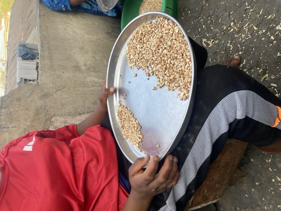 The scene is set outdoors in Sabon Gari West, Nigeria. A person with dark skin, wearing a red short-sleeved shirt and black track pants with grey side stripes, is seated and holding a silver, oval-shaped metal tray. The tray contains a quantity of light brown beans, characterized by a dark "eye" mark, distributed unevenly in two main piles and several scattered individual pieces. The individual's hands firmly grip the tray. To the right, a second person, partially visible, wears a blue patterned garment, and a green plastic basket filled with more of the same beans is situated next to them. The background features a light brown-grey, textured concrete or mud wall, above which a corrugated metal roof is visible, displaying draped laundry. The ground in the immediate foreground is dark and covered with scattered light-colored debris, possibly bean husks. Natural daylight illuminates the scene.