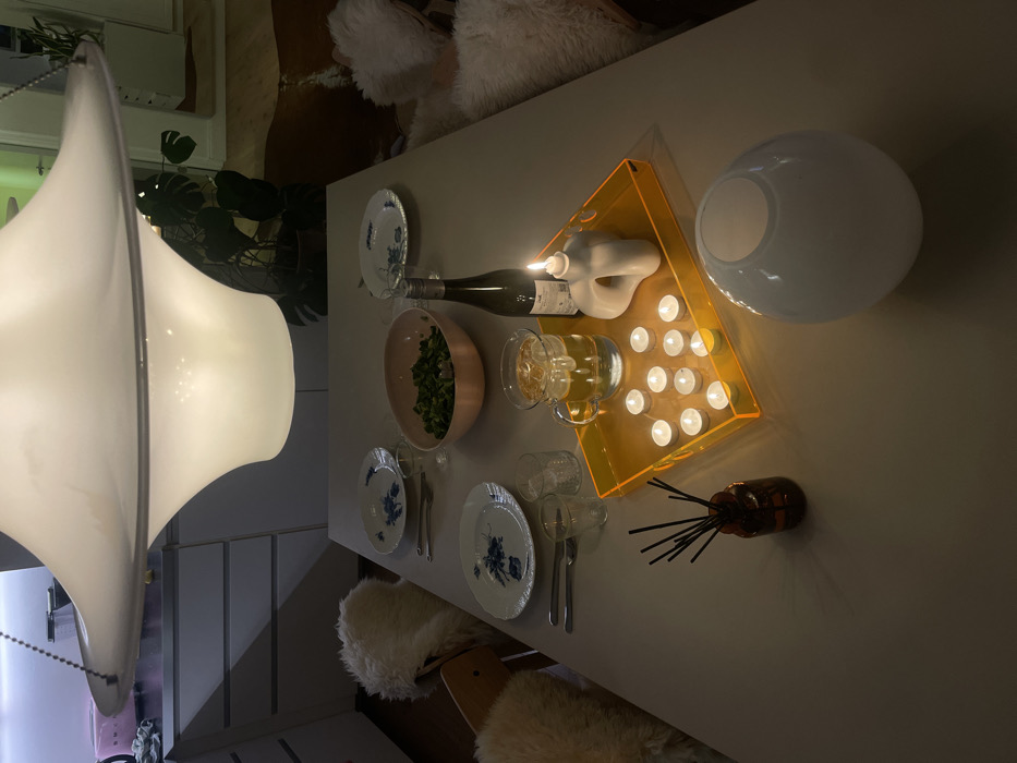 This image depicts a dining area within a residential setting in Copenhagen, Denmark, characterized by dim ambient lighting. A rectangular, light-colored dining table occupies the central and foreground space, set for at least four individuals. Each place setting includes a white plate with blue floral patterns, a fork, and a knife. Two empty drinking glasses are visible at one place setting. In the center of the table, a pink bowl contains green salad. Alongside it, a bottle of white wine stands upright. An orange acrylic tray holds eleven lit tealight candles, casting a warm glow. On this tray, a clear pitcher filled with ice and a light-colored liquid is positioned next to a white, organically shaped candle holder featuring a single lit taper candle. Towards the foreground left, a brown glass diffuser bottle with black reeds is present. A spherical white object, possibly a vase or decorative lamp, is situated in the foreground right. The chairs at the table are covered with white faux fur throws. Overhead, a large, white, mushroom-shaped pendant light fixture illuminates the table. In the background, a modern kitchen area is partially visible with white cabinets and a pink Smeg toaster. Further back and to the right, a large potted Monstera plant is discernible, and a brown and white animal hide rug covers a portion of the floor. No people are present in the scene.