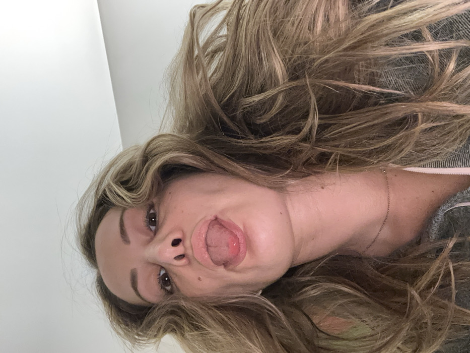 A woman's face is shown from a low angle, with her head tilted slightly to the left. She has light brown hair with blonde highlights and is sticking her tongue out. Her eyes are brown. She is wearing a gray shirt. A thin gold chain necklace is visible. The background is a plain white wall on the left side of the frame, with a bit of green visible on the bottom.