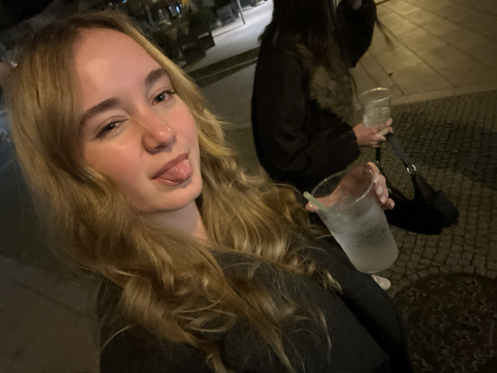 The image depicts two individuals outdoors at night in Barcelos, Portugal. In the foreground, a young female with long blonde hair winks with her right eye and extends her tongue towards the camera. She holds a clear plastic cup containing ice and a liquid, possibly with visible particulates, in her left hand. She wears dark clothing. To her right and slightly behind her, a second individual is partially visible, primarily from the torso down. This person has long dark hair and wears a dark, fur-collared jacket. They hold a similar clear plastic cup with ice and liquid in their right hand. A dark shoulder bag rests near them. The ground is paved with dark cobblestones, and a circular utility cover is visible in the lower right. The background features blurred artificial lights, indicating an urban street environment during nighttime.
