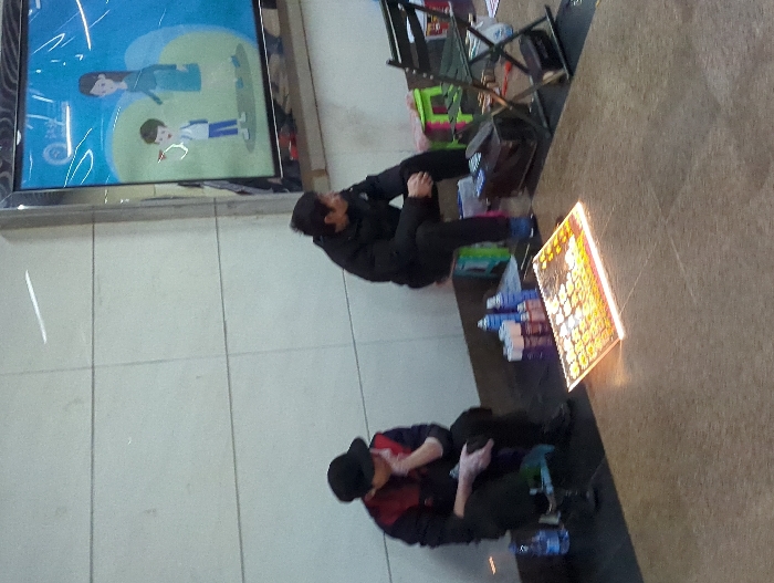 Two individuals are seen from an overhead perspective. One, clad in black, sits with legs extended, appearing to be focused on something in front. Adjacent to them is a small illuminated sign displaying alphanumeric characters. The other person wears a black hat and red clothing, also focused downward, possibly on a mobile device. A television screen showing a cartoon of a woman and child is positioned on the left. Various items, like bottles and bags, are scattered near them.