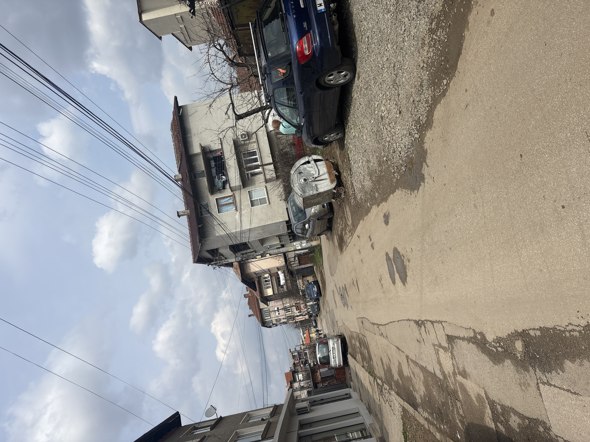 The image depicts a residential street scene in Montana, Bulgaria, under an overcast sky with scattered clouds and numerous overhead utility lines. The street, composed of asphalt or concrete, exhibits cracks, uneven patches, and multiple dark, wet areas. It extends forward, slightly curving left in the distance. On the left, a paved sidewalk borders buildings, while on the right, a gravel shoulder adjoins the roadway. Buildings flank both sides of the street. On the immediate left, a multi-story building with a light-colored facade features a ground-level storefront and an upper-level satellite dish. Further down, other multi-story residential structures with reddish-brown tiled roofs and balconies are visible. On the right, a prominent three-story building with a light grey facade, reddish-brown tiled roof, and multiple windows includes a balcony with clothes drying and an exterior air conditioning unit. Multiple vehicles are present. In the mid-ground on the right, a dark blue Subaru Impreza station wagon with a roof rack and a Bulgarian license plate (beginning with 'M') is parked on the gravel shoulder, facing away from the camera. Behind it, a silver hatchback or small SUV is partially visible next to a large, weathered, silver cylindrical metal trash bin on wheels. On the left side of the street, a silver van or hatchback with a Bulgarian license plate (beginning with 'M') is parked. Additional vehicles are parked or moving further down the street. One individual with reddish-brown hair, wearing a light blue or teal long-sleeved top, stands next to the driver's side rear of the dark blue Subaru, facing partially away from the camera. In the distant background, several blurry figures appear to be walking on the street.