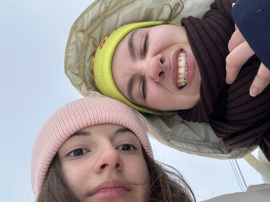 This image depicts a close-up, upward-angled selfie of two individuals, identified as being in Synelnykove, Ukraine. The subject on the left, partially visible, has long dark hair and wears a light pink ribbed beanie, with a neutral expression looking towards the camera. The subject on the right, more fully visible, wears a bright lime green beanie with red patterns, a light-colored hooded jacket, and a dark brown ribbed scarf. This individual exhibits a scrunched facial expression, showing upper teeth, and has a silver beaded septum piercing. A hand, likely belonging to the second individual and wearing a dark blue sleeve, is visible near her neck, possibly adjusting the scarf. The background is an undifferentiated light grey, suggesting an overcast sky or blurred outdoor environment.
