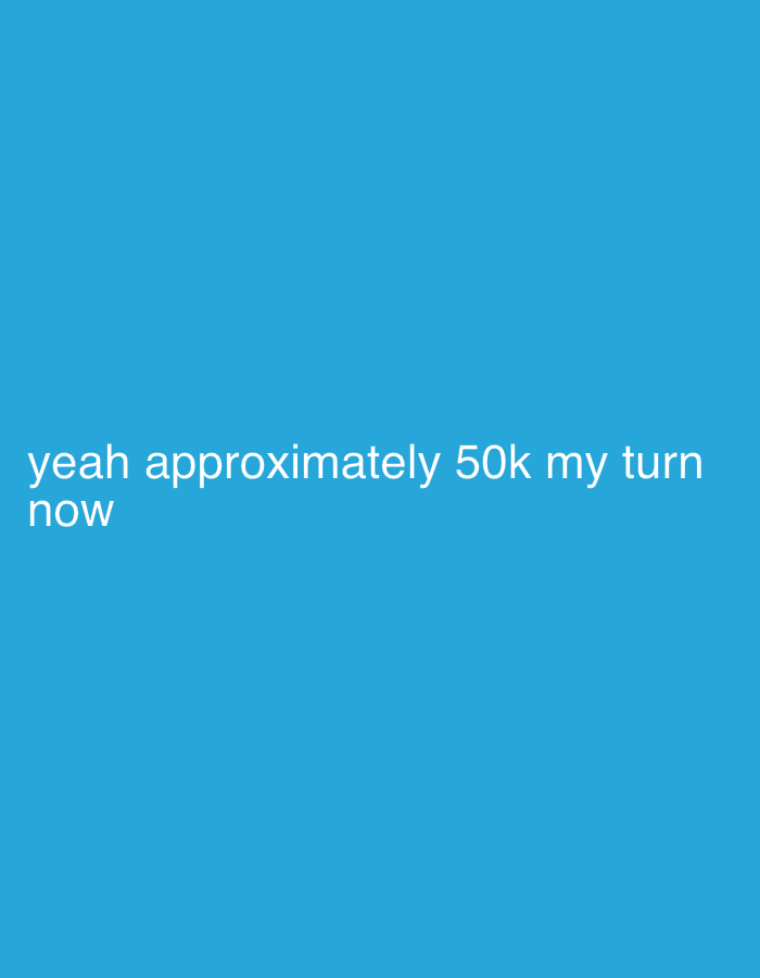 A cyan background features the text "yeah approximately 50k my turn now." The text is white and positioned in the lower left quadrant of the image. The statement suggests a conversation or exchange, possibly related to money or a competitive activity.