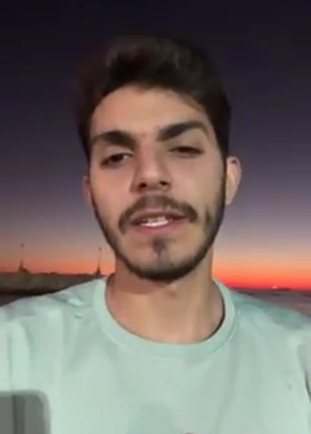 A person with dark hair and a beard stands in front of a body of water under a dusk sky. The person is wearing a light green t-shirt. The sky is dark at the top and fades to orange near the horizon where the sun has set. The water stretches to the horizon and has small waves. There's a structure visible to the left in the distance. The person speaks to the camera, gesturing with their hands and then smiling.