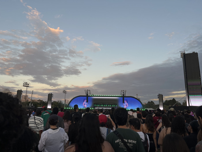 An outdoor concert or festival scene is depicted at dusk in Martínez, Argentina
