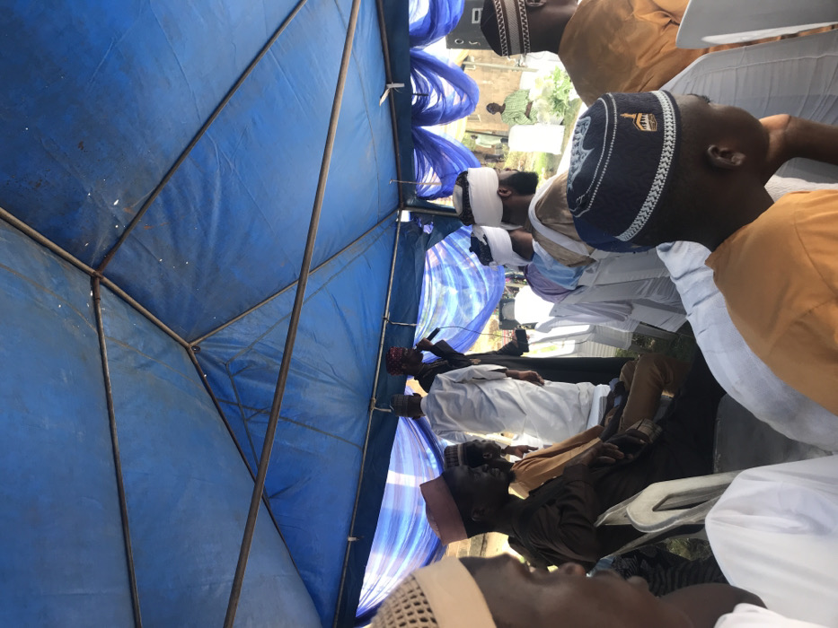 This image depicts an outdoor gathering taking place under a blue tarp canopy tent in Orudu-Olokan, Nigeria