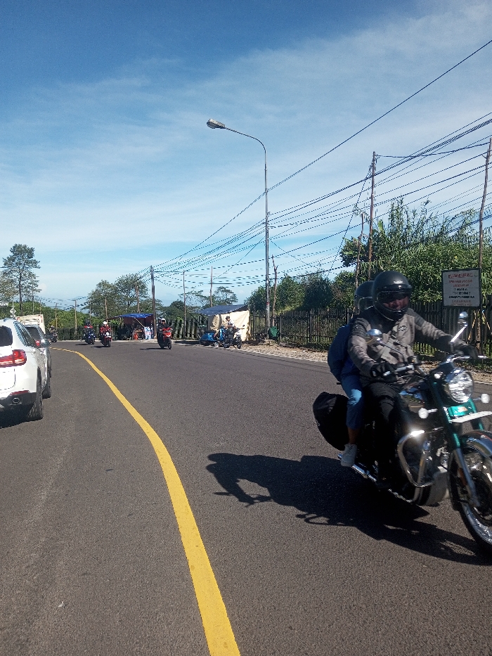 The image depicts a daytime scene on an asphalt road in Ka Thaung (Upper), Myanmar, under a clear blue sky with sparse clouds. The road features a solid yellow center line that curves gently to the left in the distance. In the immediate foreground, a person wearing a black full-face helmet, grey jacket, and dark pants operates a teal-green motorcycle equipped with chrome accents and side saddlebags. A passenger, wearing blue shorts and white shoes, sits behind the driver. Both individuals cast distinct shadows to their left on the road surface, indicating the sun is overhead and slightly to the right. To the left of the motorcycle, a white SUV is visible, partially parked or moving slowly on the far left side of the road. Further down the road, multiple other motorcycles are observed traveling in the same direction as the foreground motorcycle. Along the right side of the road, a dirt shoulder precedes a black metal fence. Beyond the fence, dense green foliage and trees are visible. Several roadside structures, including tents or stalls with blue and beige tarps, are present on the right, with individuals gathered nearby. A blue scooter is parked near these structures. Utility poles with a dense network of overhead wires run parallel to the road on the right. One pole features a single street lamp. A rectangular sign with illegible text, likely Burmese, is affixed to a pole or structure on the right. The horizon shows distant green hills or terrain.