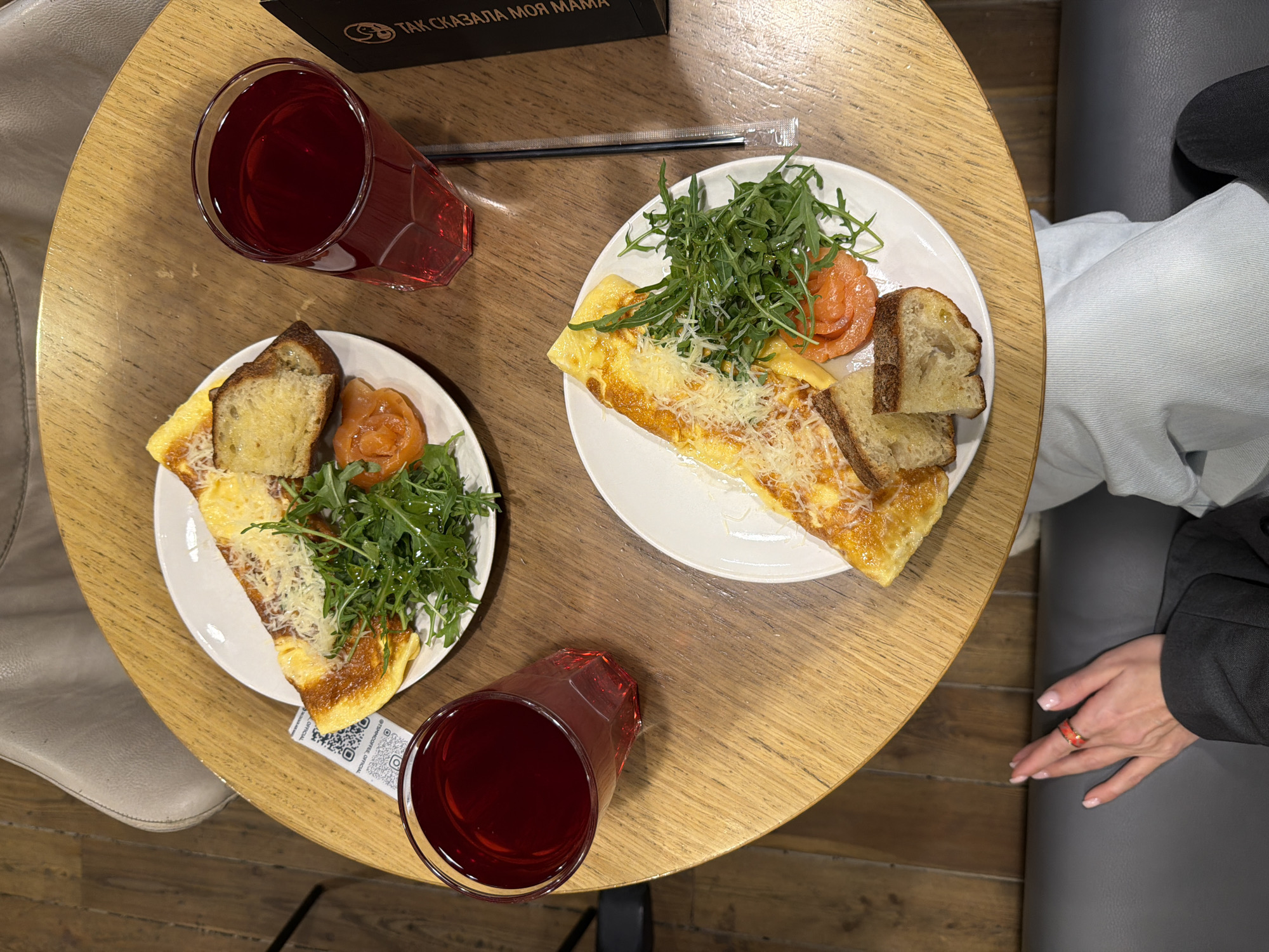 top-down view of a round wooden table with two identical plates of food and two drinks. Each plate contains a slice of omelet topped with grated cheese, a small portion of salmon, slices of bread, and a garnish of greens. Each drink appears to be a dark red beverage in a clear glass. A black box is on the table near one of the drinks. A clear straw is also on the table between the plates. A person with manicured nails and a red ring is seated at the table, wearing light-colored clothing and a black blazer. The table is situated on a wooden floor next to a gray upholstered chair. Based on the QR code on the table and the phrase “ТАК СКАЗАЛА МОЯ МАМА” on the black box, the location may be a cafe in Moscow, Russia.